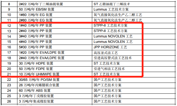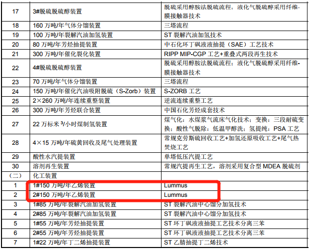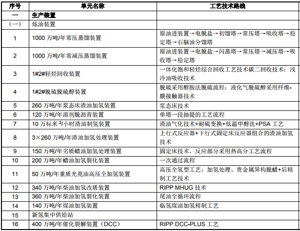 裕龍島煉化一體化項(xiàng)目(一期)主項(xiàng)表
