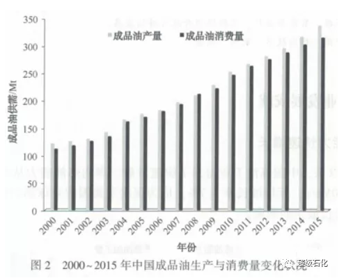 2015年,中國煉廠原油加工量為522Mt,生產(chǎn)成品油38Mt,其中汽油121.04Mt,煤油36.59Mt、柴油180.08Mt;成品油消費(fèi)量為315Mt.其中汽油114.33Mt、煤油27.44Mt、柴油173.05M。2015年成品油出口25.44Mt.進(jìn)口4.08Mt.
