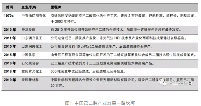 對(duì)于己二腈國(guó)外壟斷的局面,國(guó)內(nèi)化工企業(yè)正在不斷進(jìn)行技術(shù)攻關(guān)。2019年,國(guó)家發(fā)改委還將萬噸級(jí)己二腈生產(chǎn)裝置列為鼓勵(lì)類項(xiàng)目,以推動(dòng)己二腈技術(shù)的國(guó)產(chǎn)化進(jìn)程。