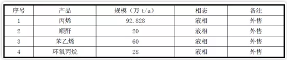 項(xiàng)目外售主要產(chǎn)品為聚合級丙烯、順酐、苯乙烯、環(huán)氧丙烷,外售副產(chǎn)品為碳四輕烴、輕芳烴、干氣、燃料油等。